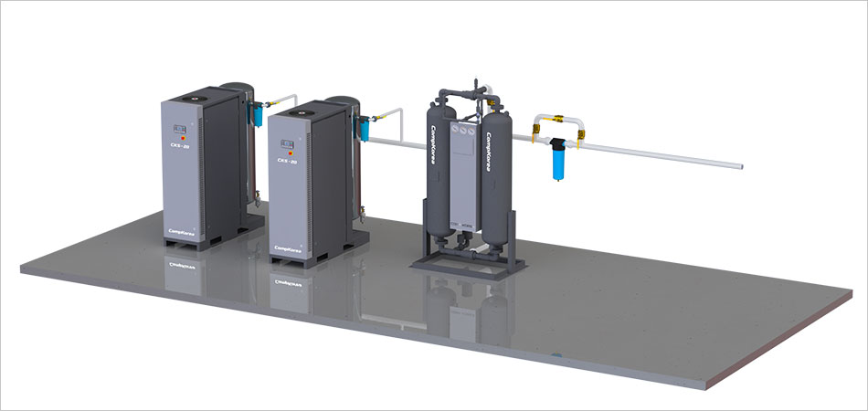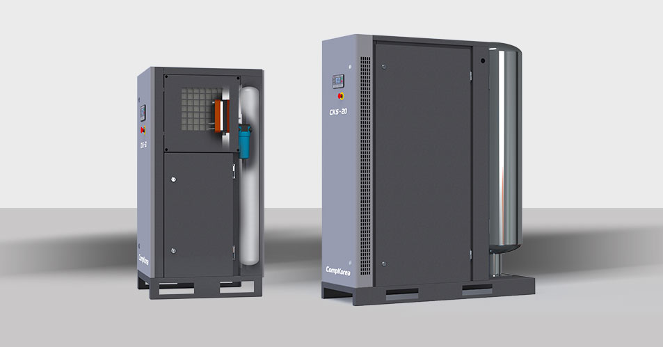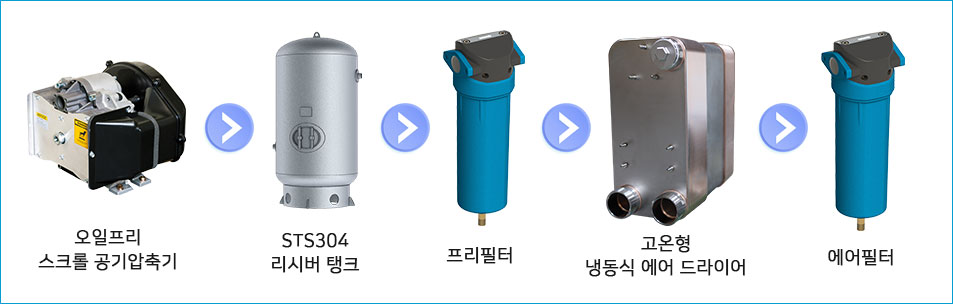 • Máy nén khí không dầu loại scroll + bình chứa khí nén + máy sấy khí lạnh loại nhiệt độ cao + bộ lọc khí LA (2EA) được tích hợp trong một thiết bị.