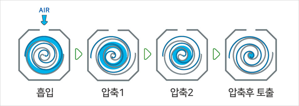 Khí nén của máy nén không dầu Scroll được tạo ra bằng cách vận hành một bộ phận gồm hai phần: một phần là ổ cố định và một phần là ổ xoay. Khí từ bên ngoài được nén khi di chuyển qua ổ xoay, nơi nó được nén vào trung tâm và di chuyển đến ổ cố định để được bơm ra dưới áp suất. Quá trình này được lặp lại để tạo ra khí nén.